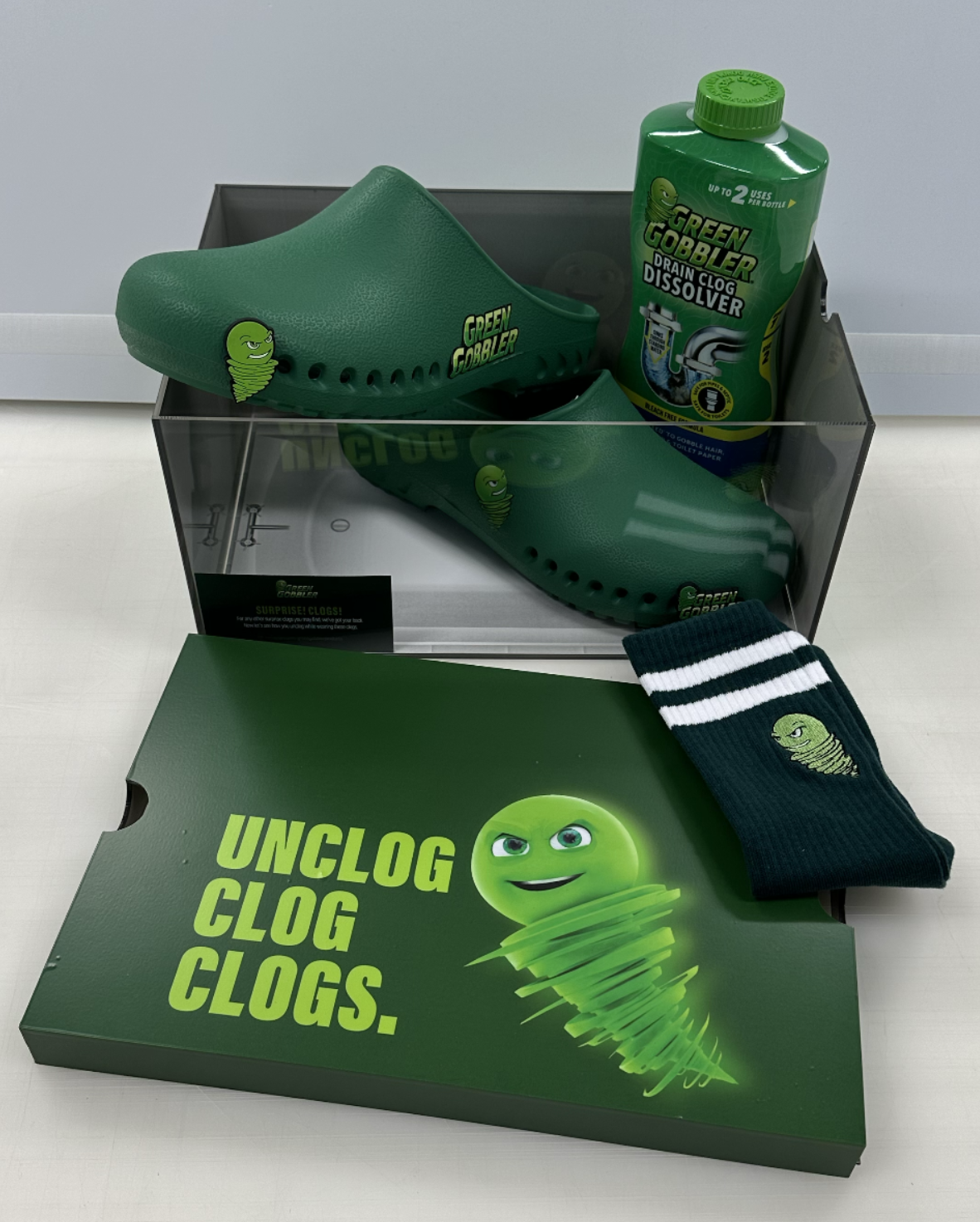 UNCLOG CLOG CLOGS came with custom socks, a bottle of Green Gobbler and custom Jibbitz for clogs all wrapped in bespoke packaging — an acrylic tub display case.